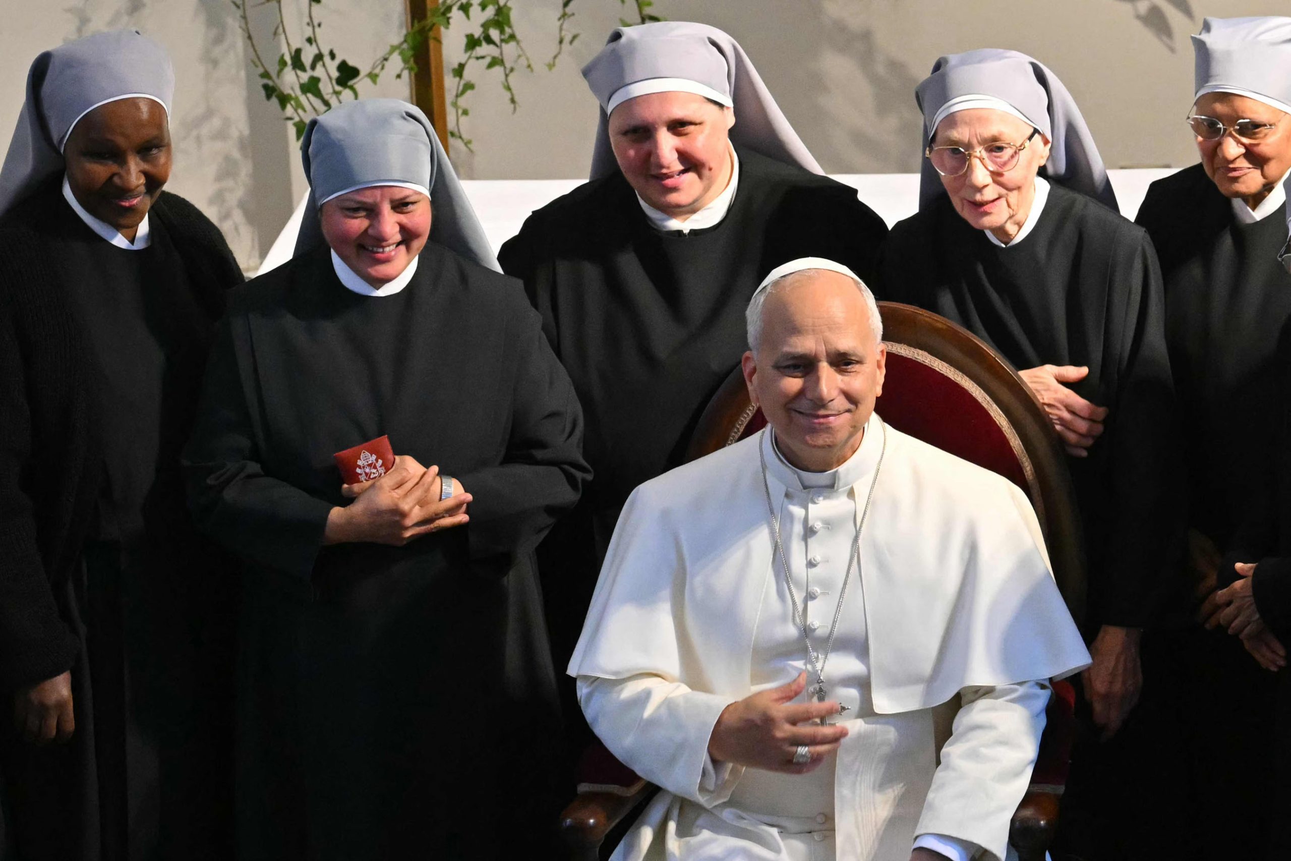 Pope Leo XIV attends a meeting with bishops, priests, deacons, consecrated men and women, and pastoral workers at the Cathedral of the Holy Spirit (St Esprit cathedral) for, in Istanbul on November 28, 2025. (Photo by Andreas SOLARO / AFP)TOPSHOT – Pope Leo XIV visits the Little Sisters of the Poor in a Home for the elderly, in Istanbul on November 28, 2025. (Photo by Andreas SOLARO / AFP)Pope Leo XIV poses with nuns during a visit to the Little Sisters of the Poor in a Home for the elderly, in Istanbul on November 28, 2025. (Photo by Andreas SOLARO / AFP)